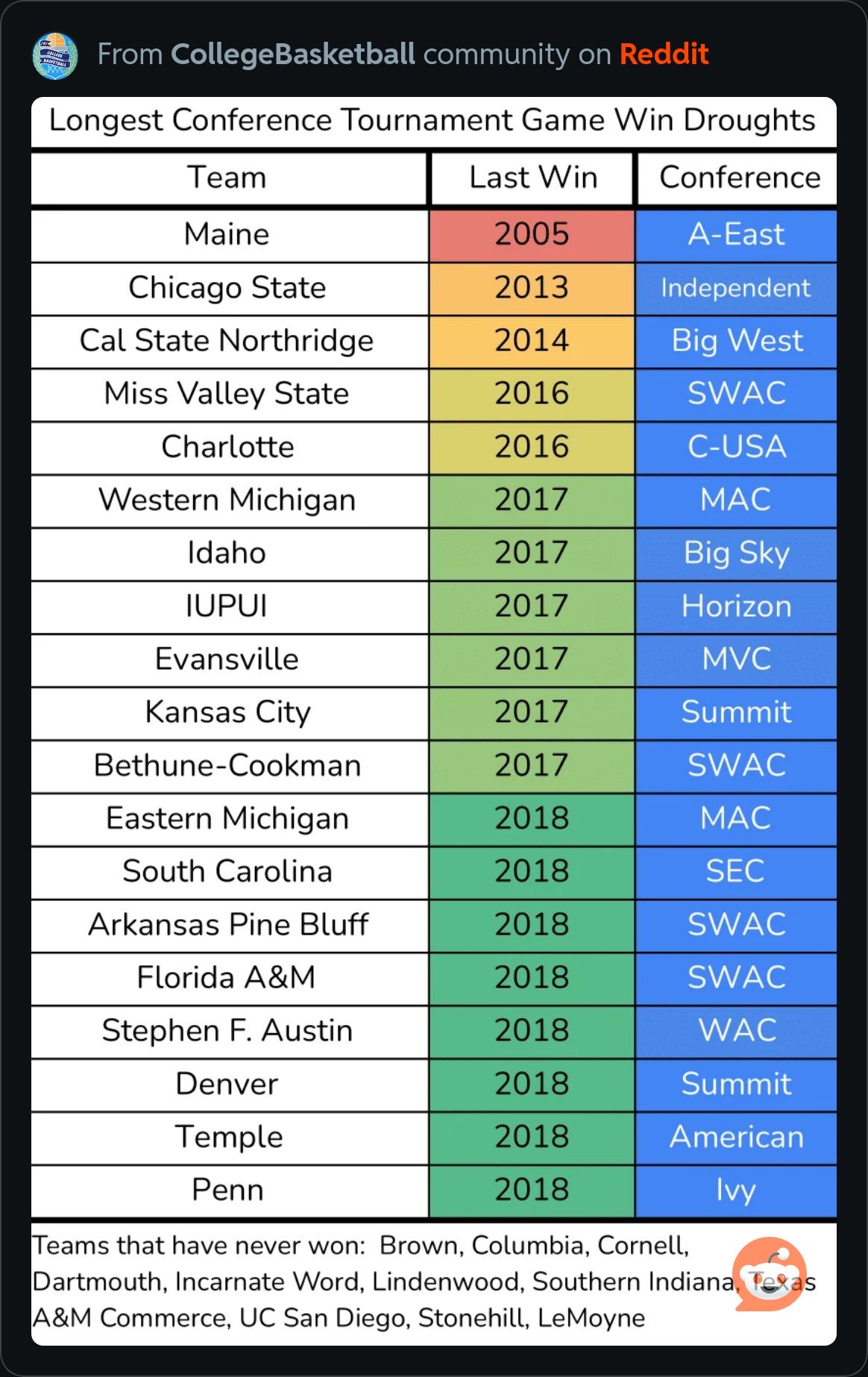 Iāve come to the realization that we are never going to be good again. Are we ever gonna make the damn NCAA tournament again? I just feel like we wonāt. The only way to do that is to get hot in our conference tourney and well we know how that goes every year. Whenās the last night we won a game in our conference tourney? Iām depressed.