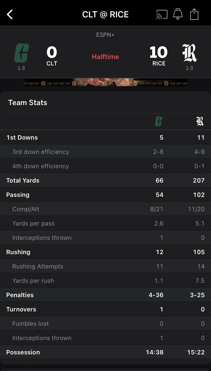 They get the ball to start the second. I bet we are down 21 5 minutes into the 3rd quarter.