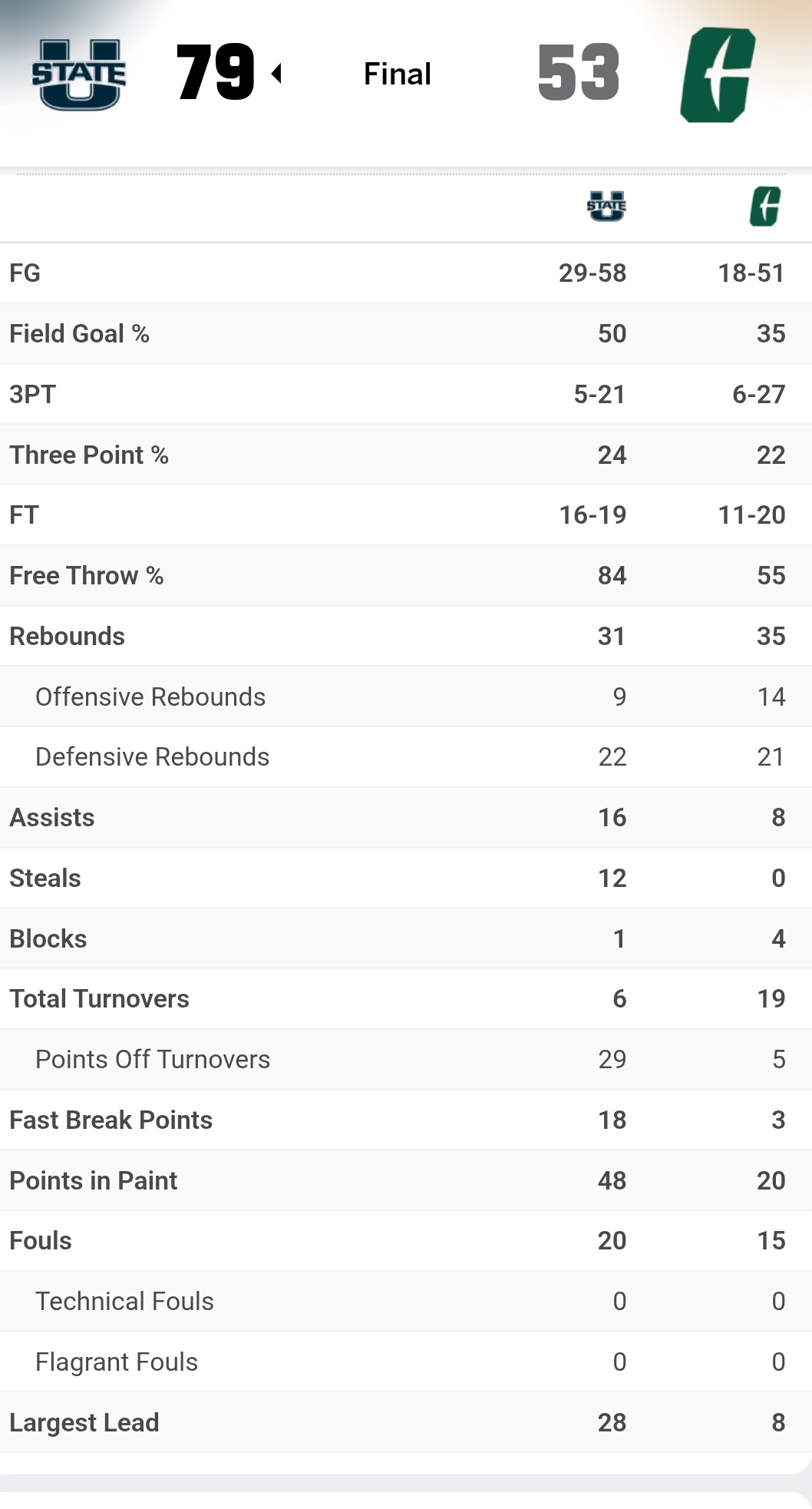 At 4:52 mark of first half it was 26-25 USU. All Aggies since.