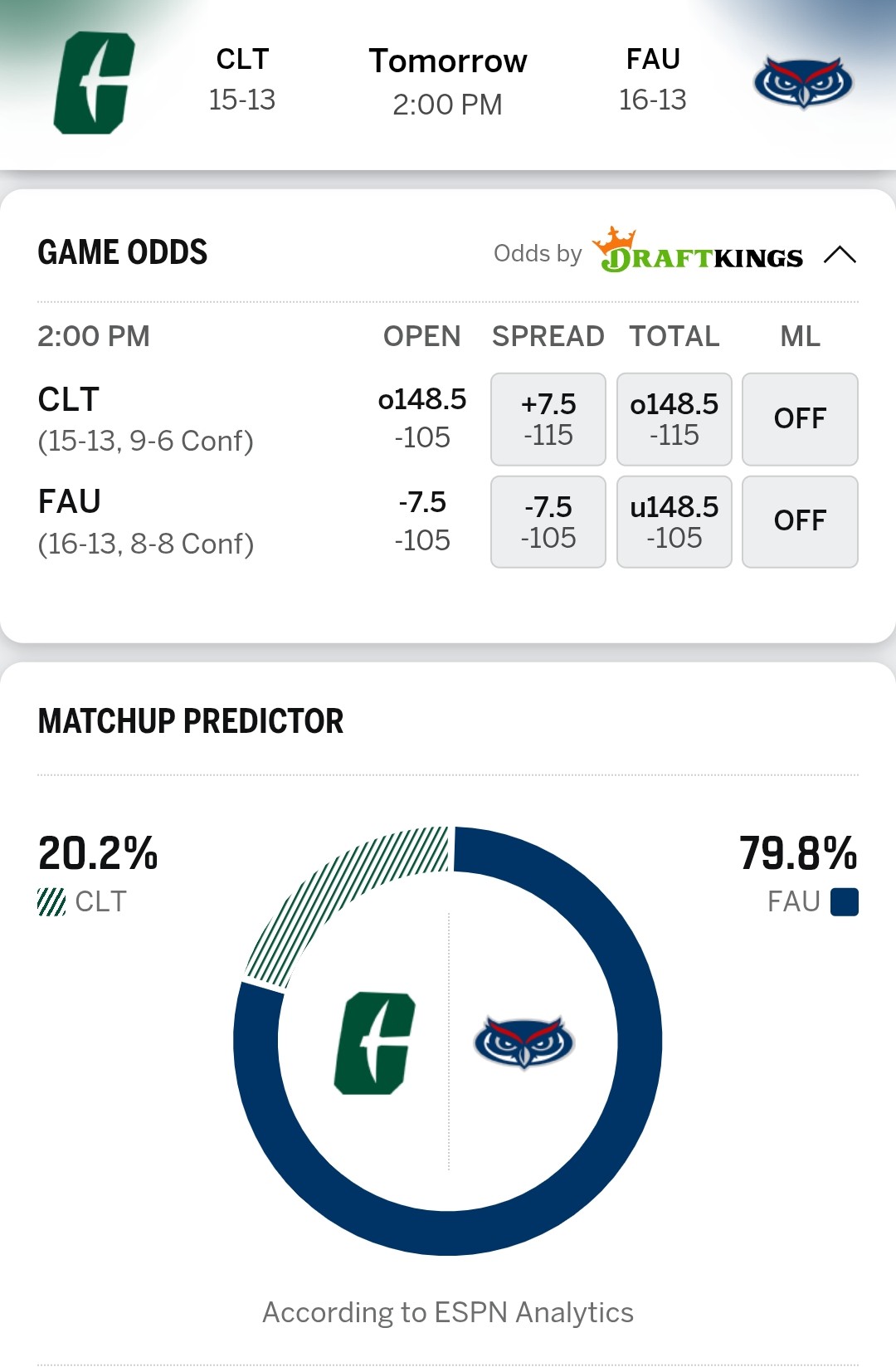 FAU leading scorer and rebounder Vanterpool is listed as out. Since their 3rd leading scorer Elohim isnโt mentioned, heโs probably playing.