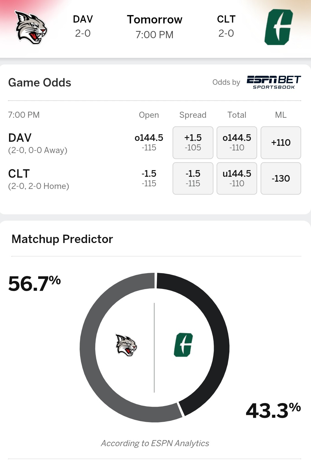 Final Score Prediction, Davidson Wildcats win and cover 78-65.