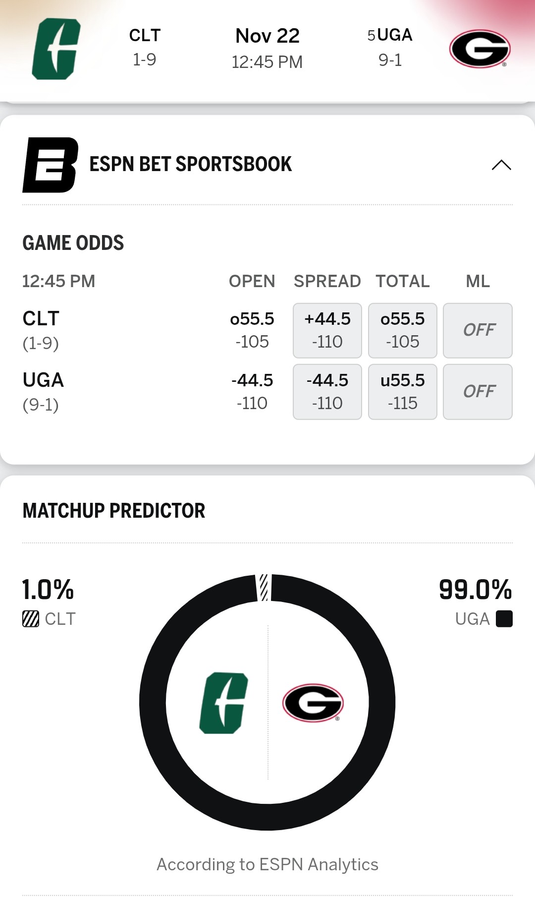 Georgia will be heavy favorites against a Charlotte team that has not beaten a Football Bowl Subdivision opponent this season. Charlotte’s lone win came against Monmouth, which is a Football Championship Subdivision program.