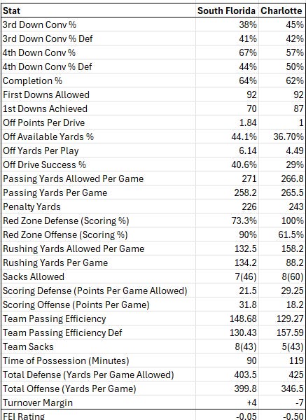 The interesting thing about that summary is how close our QB/WR/RB stats are, albeit, USF has faced MUCH harder competition. Their QB is considered to be a stud, but his #s look a whole lot like Harrell’s before Connor went down.