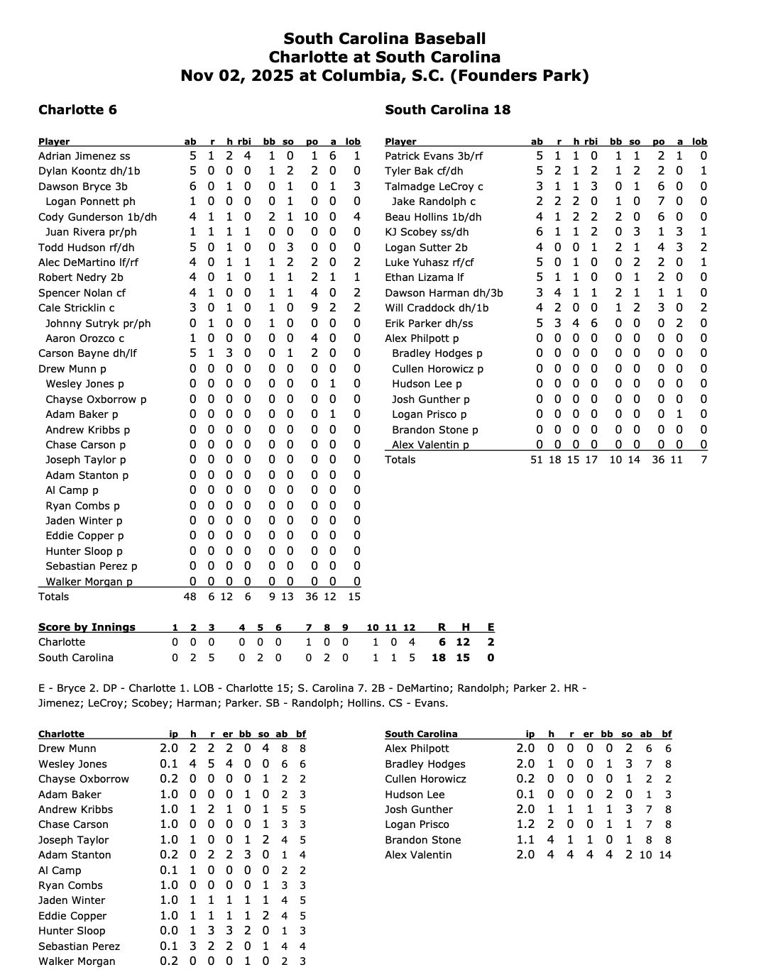 It was a typical Fall exhibition against a talented opponent. SC spent some serious money in the off season and it shows. Both sides were rotating arms in so no one got in a rhythm. We probably used 14 or 15 pitchers to get through the 112 innings.