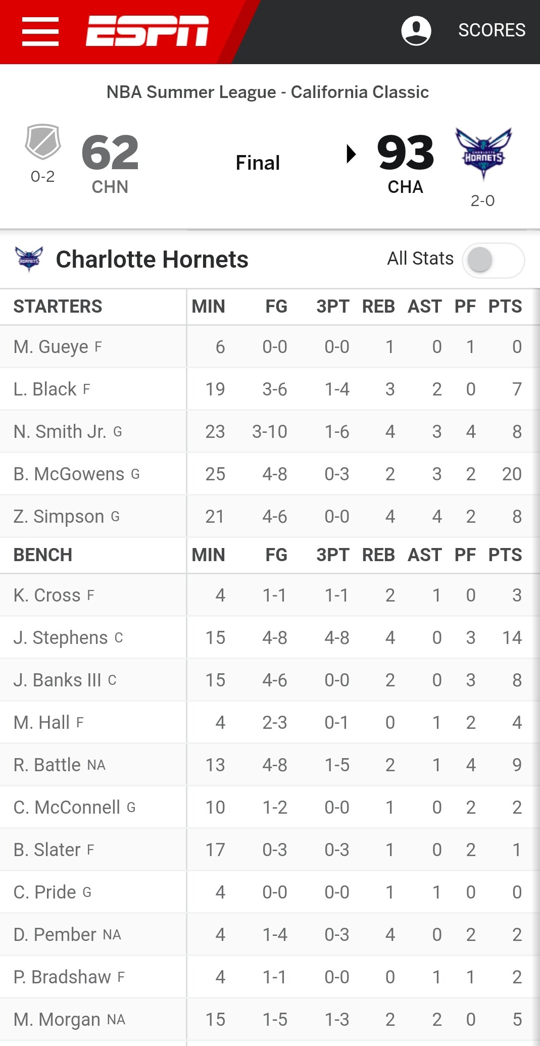 I don’t even try to understand how the NBA works per player contracts. McGowens is waived and then a look at a Hornets’ Summer League box score and he’s not only still on that roster but he’s starting, leading scorer, etc!