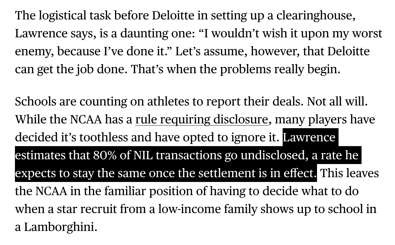 He had a good idea. Team that signs a freshman owns his rights. Those rights are separate from what the kid is getting paid. Very euro football model. So we sign a kids, we own his rights. He blows up his freshman year and South Carolina wants him, they have negotiate with us. Not a standard buy out, a negotiated payment to buy the rights they can discuss contract after. Decent way to feed money into lower brands while allowing movement. Theoretically bringing the potential to remove students fees.