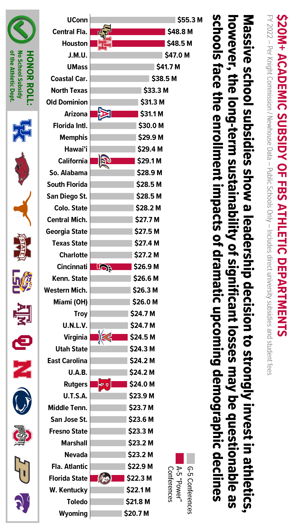 As the graph shows, there are a only a dozen public schools that donât subsidize their respective athletic programs and all are P5 (5 SEC, 4 B10, and 3 Big 12). And the larger part is a list of programs providing subsidies of $20M and above, so doesnât include those under that figure.
