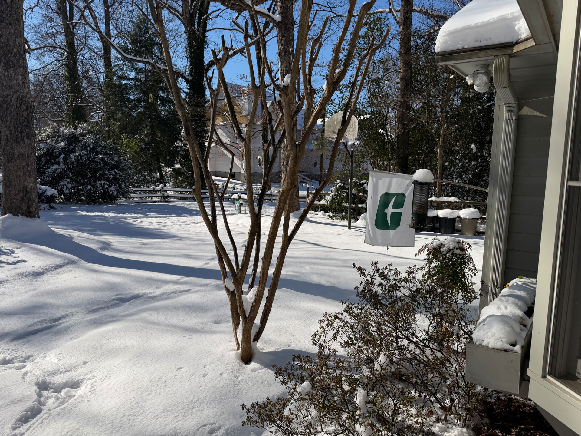 Snow, rain, or shine. Still representing’! Enlarge and you can make out my smaller flag through this crepe Myrtle near the street beside my green mailbox. ![]()