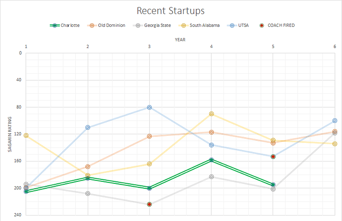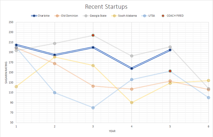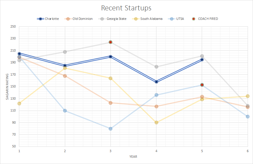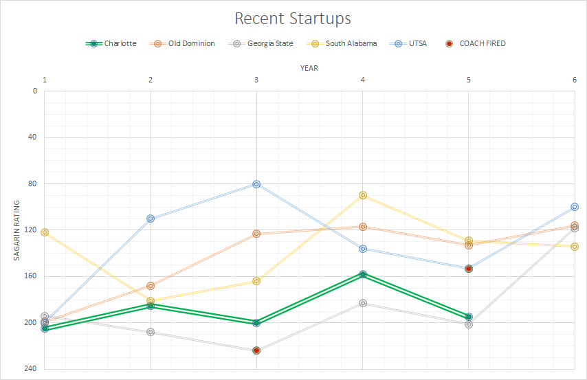 Interesting that all 5 programs regressed in Year 5. One fired their coach over it. Charlotte had the sharpest regression.