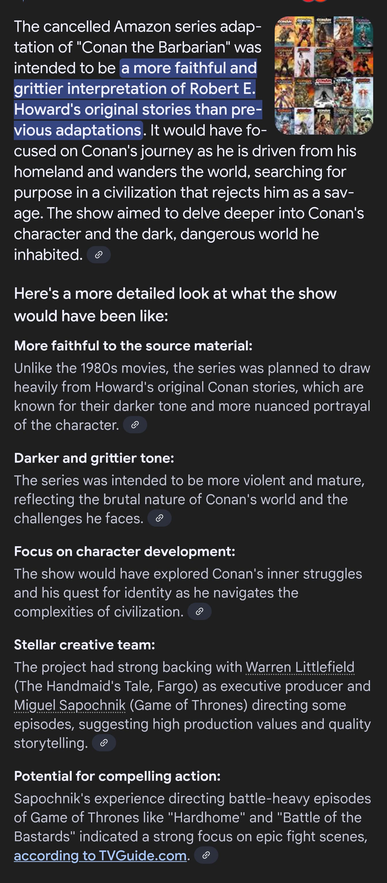 Anyway, Ryan Condal, who was the creative force behind the Conan show, moved over to HBO and helped develop House of The Dragon with Miguel Sopachnik who did some of the best later Game of Thrones episodes , including Battle of the Bastards. Sopachnik left HotD before last season though, and Condal is flying solo now as the sole producer of that show. That show has some issues because they cut out the most pivotal event (which would have been covered in 2 additional episodes) from the end of last season due to budgetary reasons.